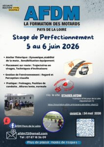 Ce stage se déroule sur 2 jours avec votre moto et est encadré par un animateur diplômé ainsi que des bénévoles de l’association. L’utilisation du regard, des exercices évolutifs, l’étude des trajectoires sur route, sont autant d’éléments qui feront que, nous l’espérons, vous gagnerez en aisance, sécurité et plaisir.